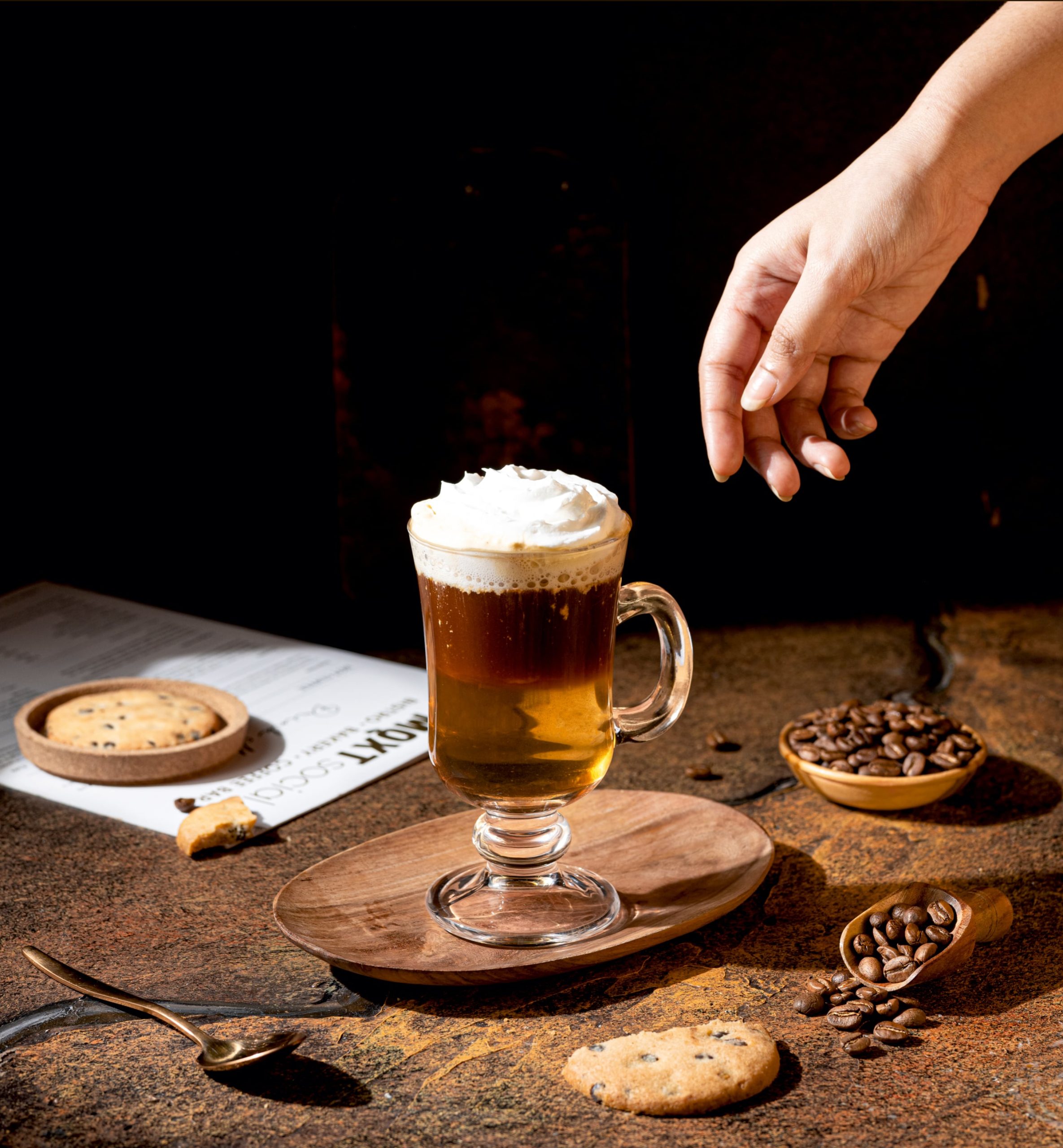 Irish Coffee ( Irish Caife Gaelach ) is a Caffeinated drink with Irish Whisky Flavour syrup steaming coffee and sugar and garnished with cream. The coffee is consumed with milk.